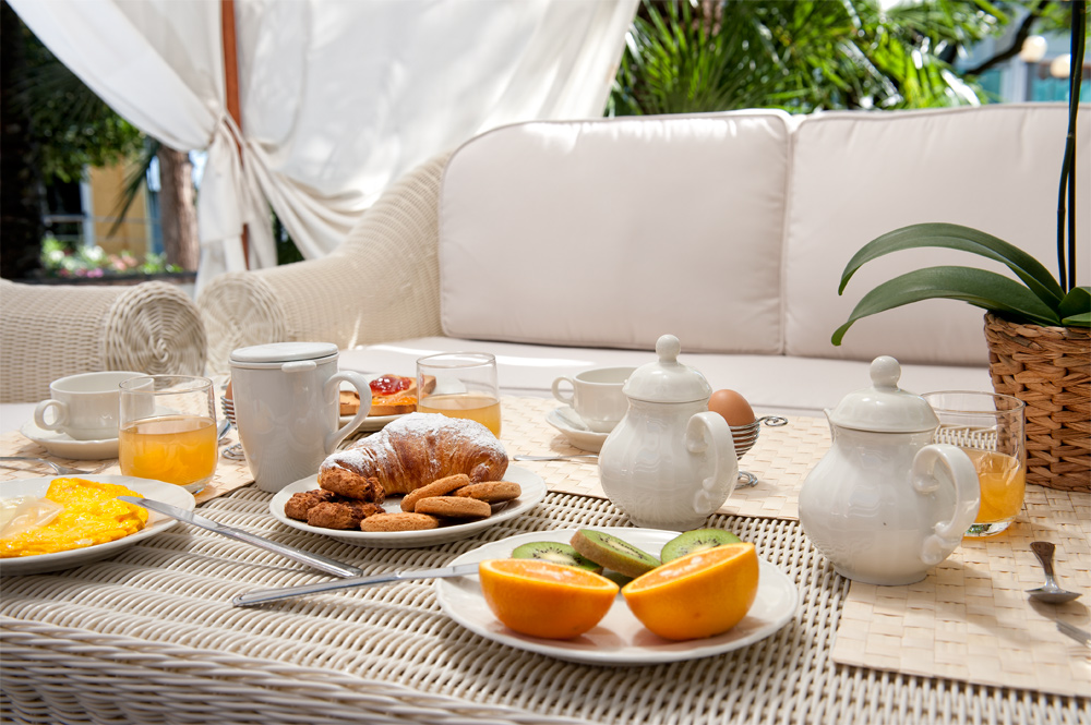 Every morning you’ll find a rich buffet breakfast to be savored in the garden or by the pool, with the sweet delights of cakes and biscuits made by our chefs, to give you a great start to the day.